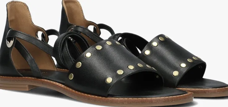 Stap in stijl met deze zwarte leren sandalen van NOTRE-V. Met de 23269 ben jij helemaal klaar voor de zomer! Deze sandalen zijn gemaakt van zwart leer met op de wreef goudkleurige ronde studs en bij de hiel twee goudkleurige veterringen waar je de veters rond je enkel kan wikkelen. Draag deze sandalen onder een zomerse jurk of een trendy witte short met zwarte top voor een complete look. Met deze sandalen aan je voeten straal je zelfvertrouwen en elegantie uit. Laat je voeten stralen en geniet van het comfort en de stijl die deze sandalen bieden.