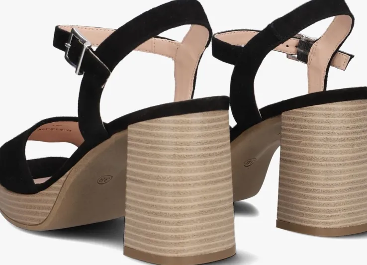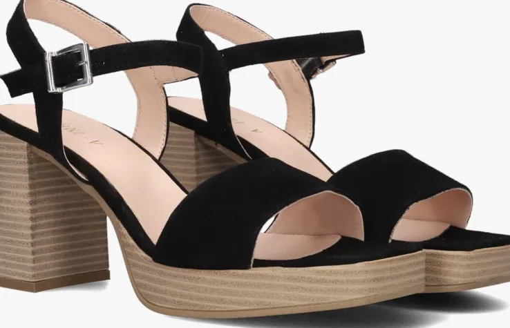De elegante Italiaanse ontwerpen van het merk NOTRE-V zijn er voor de verfijnde vrouw die er graag effortless chic uit wil zien. Gemaakt van luxe materialen met subtiele accenten en een knipoog naar de laatste trends.Deze sandaal 51303 heeft een vrouwelijke en stoere look tegelijk door de slanke vormgeving, hoge blokhak met houtlook, de vierkante neus en het sierlijke bandje om de enkel.Dit model is uitgevoerd in zwart, zacht suède met een fraai bandje op de voorvoet en heeft een leatherlook binnenvoering met een dempend voetbed voor optimaal comfort. Op de enkel bevindt zich een goudkleurige gesp en de blokhak heeft een hoogte van ruim 9 centimeter. Het plateau onder de voorvoet is ruim 2 centimeter hoog. Met deze beauty kan je de plank niet misslaan!