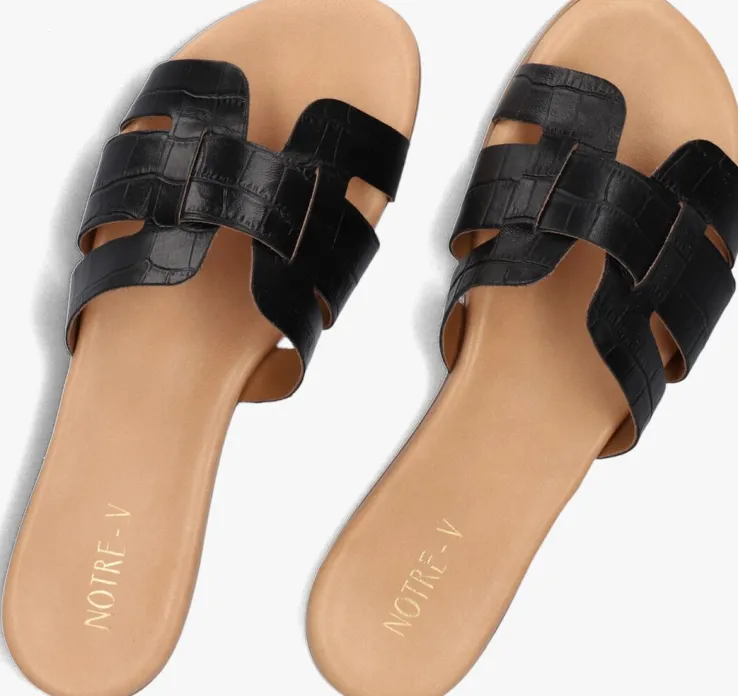 De Italiaanse ontwerpen van het merk NOTRE-V zijn er voor de moderne vrouw die graag gekleed gaat volgens de laatste trends. De producten zijn gemaakt van kwalitatieve materialen met subtiele accenten en een mooie afwerking. Deze opvallende, zwarte slipper 179874met krokodillenprint heeft een brede cut out-band over de wreef die een trendy H vormt. Het binnenwerk is gemaakt van soepel, zacht leer en heeft een dempend voetbed voor extra comfort. De rubberen loopzool heeft een laag hakje van 1 centimeter en een fijn profiel voor voldoende stabiliteit. Combineer deze slipper onder jouw favoriete zomerjurk of draag ze onder een toffe short.