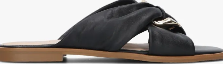 De Italiaanse ontwerpen van het merk NOTRE-V zijn er voor de moderne vrouw die graag gekleed gaat volgens de laatste trends. De producten zijn gemaakt van kwalitatieve materialen met subtiele accenten en een mooie afwerking. Deze zomerse, zwarte slipper 226 is gemaakt van zacht leer en heeft twee brede banden over de wreef met een goudkleurige schakel in het midden. Het binnenwerk is gemaakt van soepel, zacht leer en heeft een dempend voetbed voor extra comfort. De rubberen loopzool heeft een laag hakje van1,5 centimeter en een fijn profiel voor voldoende stabiliteit. Combineer deze slipper onder jouw favoriete zomerjurk of draag ze onder een toffe short!