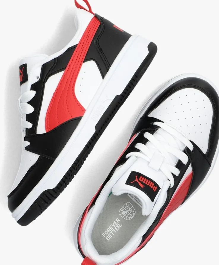 Deze lage sneaker REBOUND V6 van PUMA is een super tof exemplaar! Dit model is gemaakt van wit leahterlook met overlays van zwart leatherlook. Opvallend zijn de rode accenten, zoals het merklabel en aantreklus op de hiel, de PUMA-formstrip op de zijkant, het merklabel op de tong en de enkelkraag. De neus en zijkant zijn voorzien van perforaties voor een ademend effect en een coole retro look. De voering is gemaakt van textiel en het uitneembare voetbed samen met de gewatteerde enkelkraag zorgt voor een extra fijn comfort! De rubberen zool met zwarte loopzool heeft een gripvast profiel. Combineer ‘m onder een toffe jeans met de pijpen iets opgerold, zodat dezePUMA’slekker opvallen!