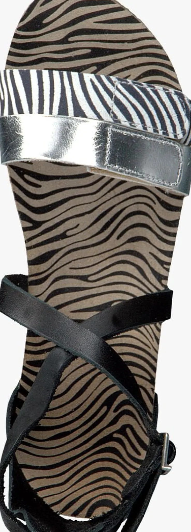 Met deze trendy sandaal 19280 van het merk RED-RAG geef jij je outfit een fashion boost! Dit model is uitgevoerd in zwart leer met twee bandjes over de voorvoet welke zijn voorzien van een klittenbandsluiting. Eén zilverkleurig leren bandje en één suède bandje met zebraprint. Ook het suède voetbed is afgewerkt met een trendy zebraprintje. Voor een optimaal comfort en een goede demping is de sandaal voorzien van een kurken tussenzool en de loopzool heeft een rubberen crêpezool.