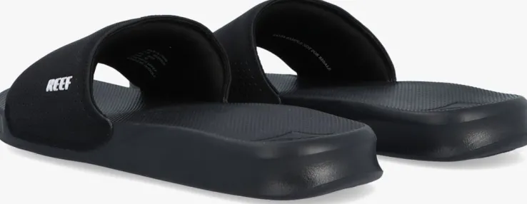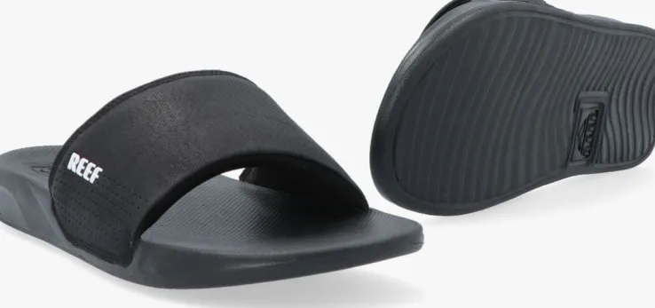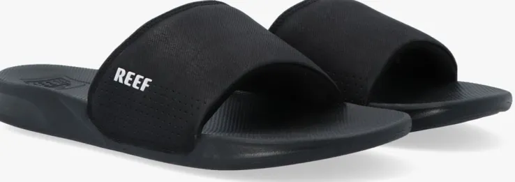Uit de collectie van het merk Reef is deze onweerstaanbaar comfortabele slipper ONE SLIDE.Dit zwart model heeft een brede wreefband van lederlook met kleine perforaties aan de zijkanten en een witte rubberen merkopruk. De voering van de band voelt heerlijk zacht aan en heeft een fijne opvulling voor een optimaal comfort.Het voetbed is van rubber en heeft een anatomische ondersteuning voor optimaal comfort en demping. De gripvaste rubberen zool loopt naar achteren op naar zo’n 2,5 centimeter dik. De idealeslipper voor ieder avontuur!