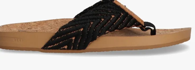 Uit de collectie van het merk Reef is deze buitengewoon comfortabele teenslipper CUSHION STRAND. Dit zwartemodel heefteen gebreide wreefband met een mooi zigzagpatroonen is afgewerkt met eentextiel teenstuk en bruin suèdeinzetmet een reliëf merkopdruk.Het binnenwerk heeft een textiel voering en het licht voorgevormdvoetbed heeft een kurken toplaag wat zorgt voor een ultieme demping en omfortabel gevoel. De hiel en de zoolrand zijn gesierd met een merkopdruk.De supersoepele zoolis voorzien van een gripvast profielvoor veel grip en stabiliteit bij iedere stap.