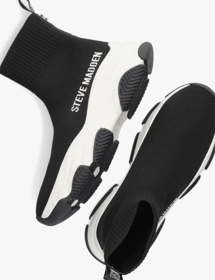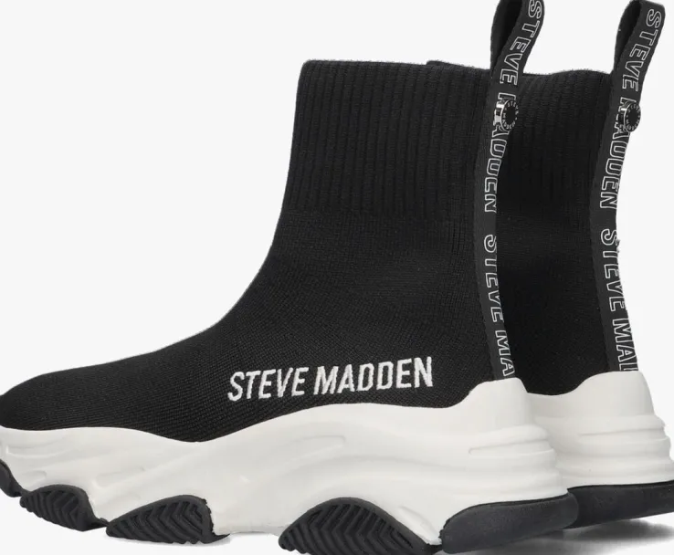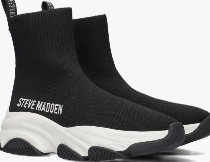 Hoe gaaf zijn deze JPRODIGY ‘knitted sok’ sneakers van het vooruitstrevende merk STEVE MADDEN! Dit zwarte item is gemaakt van gebreid textiel dat heerlijk aansluit aan je voeten. Het binnenwerk is uitgevoerd in zacht textiel met een comfortabel voetbed van foam, waardoor jij heel de dag op deze schoen kunt lopen! De witte, chunky zool met golvende lijnen en zwart accent geeft de sneaker die extra finishing touch. Een leuk detail is ook het geborduurde logo op de zijkant.Trek hem snel aan en uit met de handige aantreklus met merkopdrukken en deze is afgewerkt met een zilverkleurige stud. Combineer deze sneakers met al je favoriete outfits en je bent ready to go!