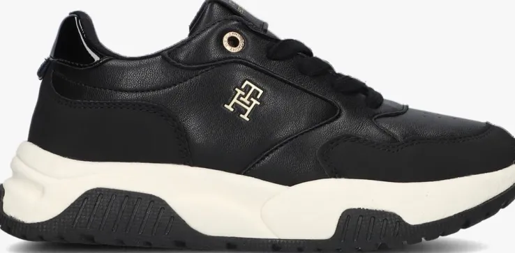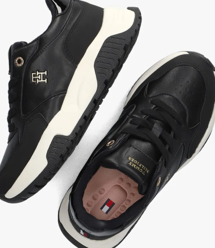 Stap in stijl met deze zwarte sneakers van TOMMY HILFIGER. De LOW CUT LACE-UP is perfect voor meisjes die op zoek zijn naar comfort en fashion in één. Met de overlays en chunky zool ben je helemaal on-trend. Opvallend zijn de perforaties op de neus, de lakleatherlook hielcap en de goudkleurige merkemblemen op de tong en zijkant. De rubberen zool zorgt voor een goede grip, terwijl het uitneembare voetbed zorgt voor extra gemak. Combineer deze lage sneakers met een stoere jeans en een casual T-shirt voor een trendy look. Of draag ze onder een jurkje voor een speelse twist.