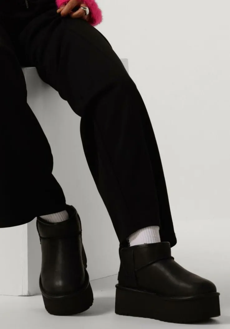 De W CLASSIC ULTRA MINI PLATFORMis een van de meest geliefde en legendarische modellen van het merk UGG!Dit zwarte model is gemaakt van leer en heeft een heerlijk zacht binnenwerk van UGGplush™materiaal, wat is gemaakt van 80% wol en20% plantaardig lyocell voor een extra zacht en duurzaam karakter. Het voetbed is niet uitneembaar.DeTreadlitebyUGG™ plateauzool van 6 centimeter geeft je nog meer lengte, comfort, demping en grip en is superlicht van gewicht. De hiel is voorzien van het welbekendesuède merklabel en aantreklus. De schacht heeft decoratieve opstaande naden.Deze veelzijdige laarsjeslaten zich gemakkelijk met vrijwel alles combineren. Probeer eens een losse boyfriend jeans met een fluwelen top of zelfs een zwierige maxi-jurk.