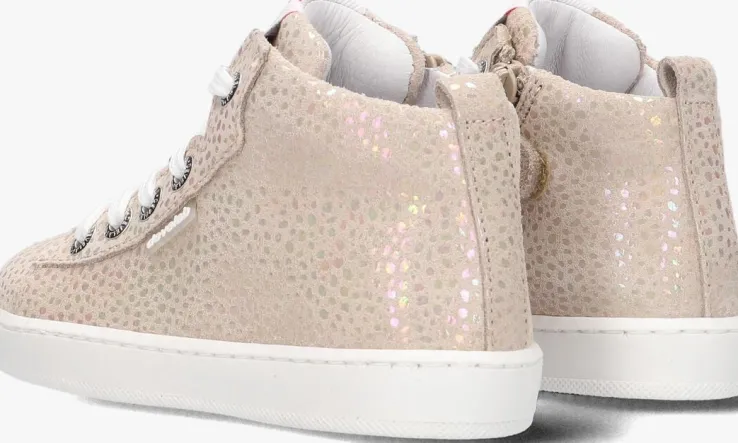 Op dezeschattige hoge sneakers 41492 van het merk DEVELAB zie jij je kleine meid toch al lopen? De buitenkant is gemaakt van beige suède met een kleurrijke holographic folie met stippenprint. De tong is gesierd met eentextiel merklabel, op de zijkant zit een rubber merklabel en de veterringen zijn gesierd met merkreliëf. Aan de binnenzijde van de schoen is een ritssluiting met klittenbandje bevestigd, waardoor je ‘m gemakkelijk aan- en uittrekt bij jouw kleintje. Het binnenwerk heeft een comfortabele, lederen voering en een uitneembaar voetbed.Het rubberen zooltje is voorzien van een gripvast golvend profiel waardoor jouw kleintje veel grip heeft bij het klimmen en klauteren.