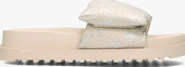 Voeg een zomerse uitstraling toe aan je outfit met deze beige slipper FABETZY uit de collectie van het merk GUESS! Deze slipperheeft een brede band met zilverkleurige merkopdrukken over de wreef en heeft een klittenbandsluiting. De band is gevoerd met lederlook materiaal en het licht opgevulde voetbed met een suèdestuk onder de hiel zorgtvoor een prettig loopcomfort. De rubberenzool met grof profiel zorgt voor uitstekende grip tijdens lange avondwandelingen. Draag deze sprankelendeslipperonder jouw favoriete zomeroutfit en steel de show!