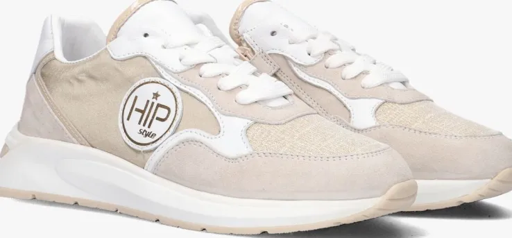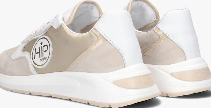 Het merk HIP heeft niet voor niks het woord ‘hip’ als merknaam. Met de schoenen uit de collectie van dit merk ben jij gegarandeerd van een hippe schoen en loop je er altijd trendy bij. Deze goudkleurige, lage sneaker H1094 is uitgevoerd in goudkleurig nylon op de zijkant, heeft goudkleurig glittertextiel op de neus en is voorzien van leren en suède overlays in de kleuren wit en beige. Opvallend is het leren merkembleem op de zijkant en de witte tong met beige lak afwerking. Dankzij de ritssluiting naast de vetersluiting trek je ‘m gemakkelijk aan en uit. Voor een stoere look is dit model afgewerkt met een rubberen chunky zool en een bruine inzet met merkreliëf. Het binnenwerk is gevoerd met leer en heeft een uitneembaar, leren voetbed. De zool is voorzien van een gripvast profiel voor een goede grip en uitstekende stabiliteit!
