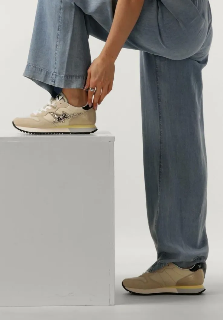 SUN68 is een Italiaansmodemerk met casual designs van de beste materialen om iedere dag te dragen. Er is veel aandacht voor originele details en onderzoek ingoede materialen. Dit beige modelSTARGIRL GLITTER LOGOmet zwarte accenten en glitters is uitgevoerd in stevig textielenheeft een afwerking van beige suède panelen. Op de tong bevindt zich een textiellabel met merkopdruk en de hiel heeft een hielkap van zwart lak met witte merkopdruk. De beige glitter mesh op de neus, de glitter ster met merkopdruk op de zijkant en de gele inzet in de zoolrand maken ‘m extra opvallend. Deze lichtgewicht sneaker is gevoerd met ademend mesh in combinatie met zacht textiel en heeft een uitneembaar voetbed met comfortabele demping. Door de gewatteerde enkelkraag en tong ervaar je veel steun en comfort en de witte oplopende zool metzwarte loopzool heeft dankzij de ribbels in het profiel een optimale grip. Wissel de veters af door de mint kleurige veters te gebruiken voor een extra uitbundige look of de witte veters voor een rustigere look!