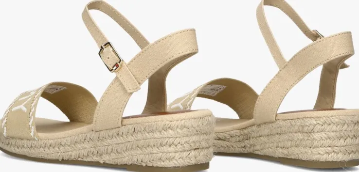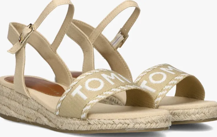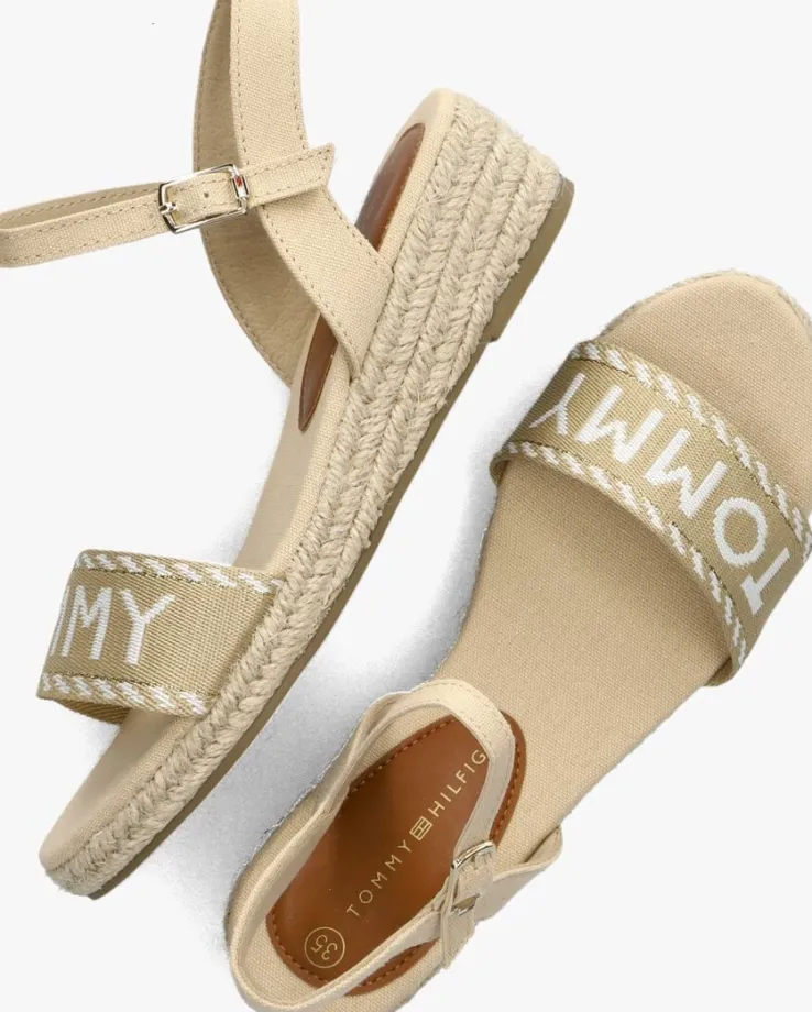 Op zoek naar de perfecte sandalen voor de zomer? Deze beige TOMMY HILFIGER sandalen 33287 zijn precies wat je nodig hebt! De sandalen zijn gemaakt van canvas waarbij de band op de wreef mooi is afgewerkt met opvallende glitter stiksel en het wel bekende vlaglogo. Het enkelbandje heeft een makkelijke gespsluiting om ‘m goed passend te maken aan je voet. Opvallend is de tussenzool van gevlochten jute met een hakhoogte van 5 centimeter en een laag platteau van 2 centimeter onder de voorvoet. De voering is ook gemaakt van canvas en heeft een zachte demping in het voetbed. De rubberen zool heeft een gripvast profiel en met deze beauty’s hou je het urenlang vol op de boulevard!