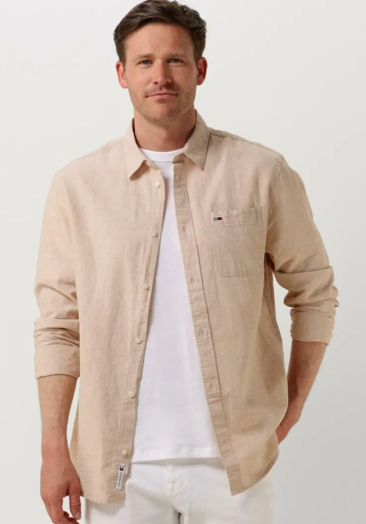 Met het TOMMY JEANS TJM REG LINEN BLEND SHIRT ben jij helemaal on-trend deze zomer! Dit casual beige overhemd is perfect voor een dagje strand of een gezellige barbecue met vrienden. Combineer het met een stoere jeans en sneakers voor een relaxte look, of draag het onder een colbert voor een meer geklede uitstraling. Met dit overhemd zie jij er altijd stijlvol uit, waar je ook naartoe gaat. Perfect voor heren die houden van comfort en fashion!