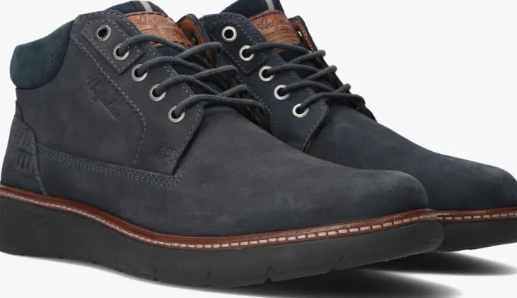 Casual donkerblauwe veterboot DEXTER met bruine accenten van het merk AUSTRALIAN. Dit model heeft een fraai bovenwerk van zacht nubuck met zilverkleurige veterringen, een bruin label van leer met merkopdruk op de tong en op de zijkant bevindt zich een reliëf merkopdruk. De hiel is voorzien van een verstevigende hielcap van blauw leer met krokodillen print en een handige aantreklus van zwart textiel met een grijze accentstreep, deze is ook terug te zien op de tong. Het binnenwerk is van zacht cognac kleurig leer en heeft een uitneembaar voetbed. De enkelkraag is opgevuld en biedt veel ondersteuning en comfort. Ook de sportieve zool met profiel van opgedeelde vlakken zorgt voor een comfortabel loopcomfort en een uitstekende grip. De perfecte sneaker voor een fijne citytrip! Een extra leuk detail aan deze schoen is de lederen sierrand met goudkleurig stiksel die de schoen net even wat chiquer maakt.