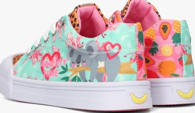 GO BANANAS! Dat gaat zeker lukkenmet deze leuke lage sneakersKOALA uit de collectie van het gelijknamige merk. Dit vrolijke merk zorgt voor een lach op een ieders gezicht! De buitenkant is gemaakt vanstrak geweven canvas in een groene, oranje en roze kleur en is voorzien van diverse prints. Zo vind je aande ene kant een groene koala print, aan de andere kant een roze print met diverse fruit soorten en een stoere zonnebril en is de tong en neus gesierd met oranje canvas en een zwarte stippen print. Leuk detail is het banaantje achterop de hiel, de metalen veterringen en de tong met een zilverkleurig metallic label met goudkleurig merkopdruk. Extra handig is de witte rubberen stootneus, hierdoor kan de schoen tegen een stootje en blijft de schoen langer mooi. Want bij het klim en klauteren, buitenspelen of een potje voetballen mag niets in de weg staan! Het binnenwerk heeft een canvas voering met een antibacteriële en uitneembare binnenzool. De roze loopzool is voorzien van een gripvast profiel.