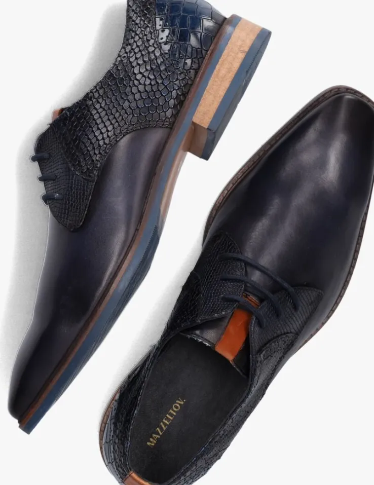 MAZZELTOV. is hét merk voor de modebewuste man die er graag goed uitziet, de trends volgt en zijn stijlen op verschillende manieren combineert. In de collectie vind je diverse invloeden van klassiek tot retro en van stoer tot sportief, er is vast wel een model wat jouw aanspreekt. Deze donkerblauwnette schoen ENZO is uitgevoerd in hoogwaardig glad leer en is afgewerkt meteen opvallende reptielenprint op de veterklep, enkelkraag en hiel. De schoen sluit door middel van een klassieke derby-sluitingmet ronde veters. De print op het bovenwerk zorgt voor een unieke look en trendy uitstraling. Dit model is leer gevoerd in combinatie met textiel en heeft een comfortabel vast voetbed. De rubberen loopzool heeft een mooie blauwe kleur en dankzij het gripvaste profiel ervaar je veel grip en stabiliteitop verschillende ondergronden. De perfecteschoen voor een stijlvolle look op ieder moment! Combineer ‘m onder je nette pak of juist onder heel casual met een jeans.