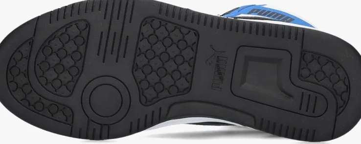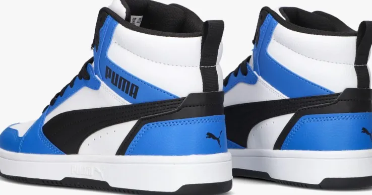 Maak kennis met deze hoge sneaker REBOUND V6 MID van het merk PUMA. Deze stoere sneaker heeft een cool design van wit leer met blauwe en zwarte panelen van leatherlook. De zijkant is voorzien van een Puma-formstrip, de hiel is fraai afgewerkt met een zwart catlogo en de tong is gesierd met een label. Het binnenwerkbestaat uit textiel en heeft een uitneembaarvoetbed die superzacht en comfortabel aan voelt.De zool met merkreliëf ziet er super tof uit en de zwarte loopzool biedt een uitstekende grip. Combineer ‘m onder een toffe jeans met de pijpen iets opgerold, zodat jouwPUMA’slekker opvallen!