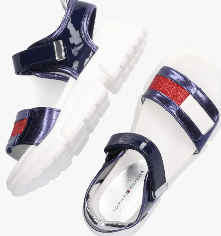 Met deze trendy sandaal 31046van het merk TOMMY HILFIGER straal jij als de zon! De buitenkant is gemaakt van blauw metallic lederlook en het bandje aan de voet is volledig afgewerkt met het bekende merklogo met glitters. Beide bandjes zijn voorzien van een klittenbandsluiting waardoor je ‘m niet alleen gemakkelijk aan- en uittrekt maar ook perfect passend maakt aan de voet. Het binnenwerk is uitgevoerd in lederlook met een comfortabel zacht voetbed en de verdikte rubberen zool heeft een stoere look en een gripvast profiel.
