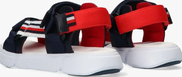 Met een stoere en stevige sandaal ben jij klaar voor alle fijne dagen buiten. Dit model 31111 komt uit de collectie van het merk Tommy Hilfiger en heeft een stoere look dankzij de grove banden en opvallende zool. Het bovenwerk isuitgevoerd in donkerblauw lederlook in combinatie met rood, wit en blauwe textiel banden met een klittenbandsluitingaan de voorvoet,wreef en hiel waardoor je ‘m niet alleen heel gemakkelijk aan-en uittrekt maar ook nog eens perfect afstelt aan je voet. De zijkant is gesierd met eenlogotape.Het binnenwerk heeft eenrodemeshvoering en een rubberen voetbedmet merkopdruk en extra ondersteuning. De zool is gemaakt van rubber, is flexibel en voorzien vanchunkyvormen wat de stoere look benadrukt. Hetgripvasteprofiel zorgt voor een stevige grip.