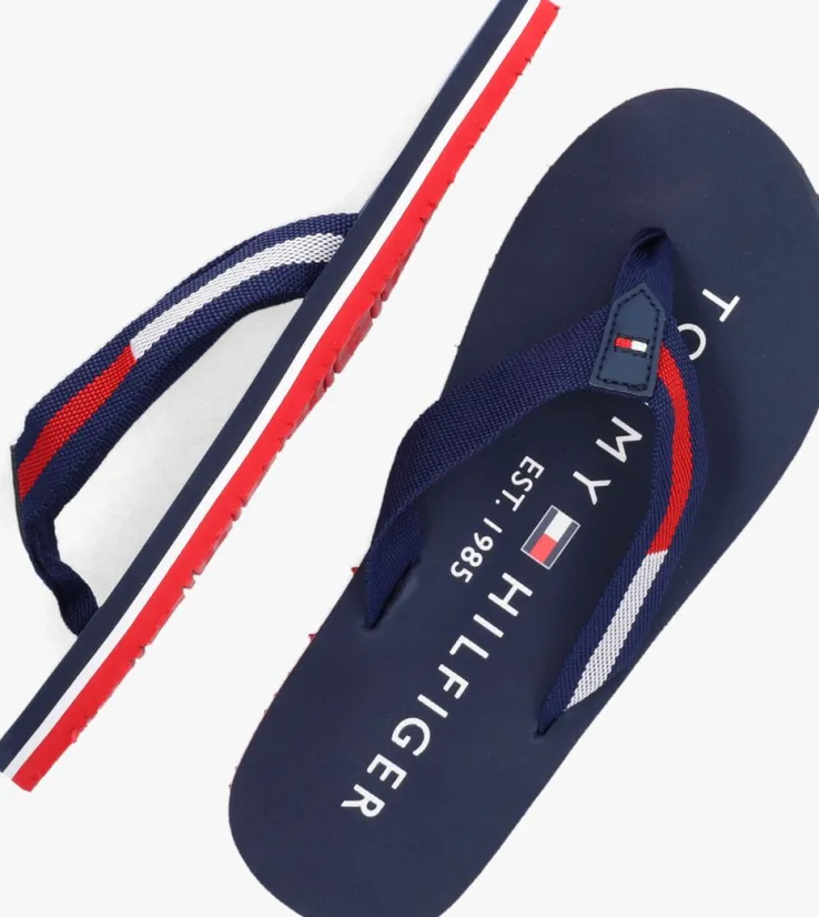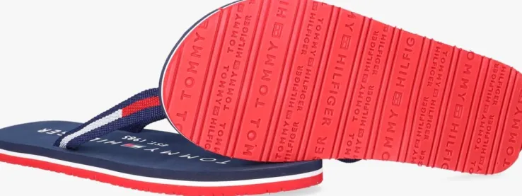 Met deze lichtgewichtblauwe teenslipper 30983van het merk TOMMY HILFIGER loop jij heelfashionablelangs het zwembad, op het strand of gewoon heelcomfydoor de stad. Het bandje over de voet is uitgevoerd inblauw met rood en wit textiel en is voorzien van een merklogoen opdruk. Het voetbed voelt zacht aan onder de voet en is voorzien van een oversized merkopdruk.Hetgripvasteprofielonder de donkerblauwe zoolzorgt ervoor dat jij zelfverzekerd rond kunt lopen!
