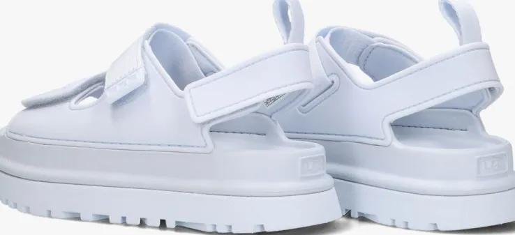 Stap in stijl met de UGG K GOLDENGLOW sandalen! Deze sandalen zijn gemaakt van lichtblauw leer en hebben drie klittenband sluitingen waardoor je ‘m gemakkelijk naar de gewenste breedte kunt verstellen. Opvallend is de aantreklus aan de hiel en het merkembleem op de voorvoet en achterop de zool. De binnenvoering is gemaakt van textiel en heeft een rubber voetbed. De zool is ook van rubber en heeft het welkbekend ugg logo. Combineer ze met een zomerjurkje of een trendy jumpsuit voor een complete look. Met de UGG K GOLDENGLOW sandalen ben je klaar voor elke zomerse gelegenheid!