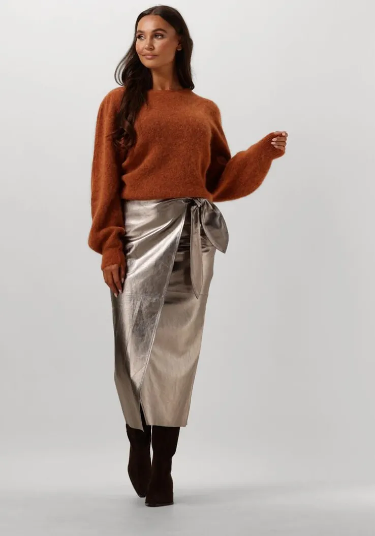Laat je stralen met de SIARA METALLIC midirok van IBANA. Deze bronskleurige rok is een echte eyecatcher en perfect voor een avondje uit of een chique diner. De glanzende metallic stof geeft je outfit een luxe uitstraling. Combineer de rok met een zwarte coltrui en enkellaarsjes voor een stijlvolle look. Of draag ‘m met een witte blouse en hakken voor een elegante touch. De midilengte zorgt voor een verfijnde uitstraling, terwijl de bronzen kleur je look net dat beetje extra geeft. Voeg deze must-have toe aan je garderobe en schitter bij elke gelegenheid.