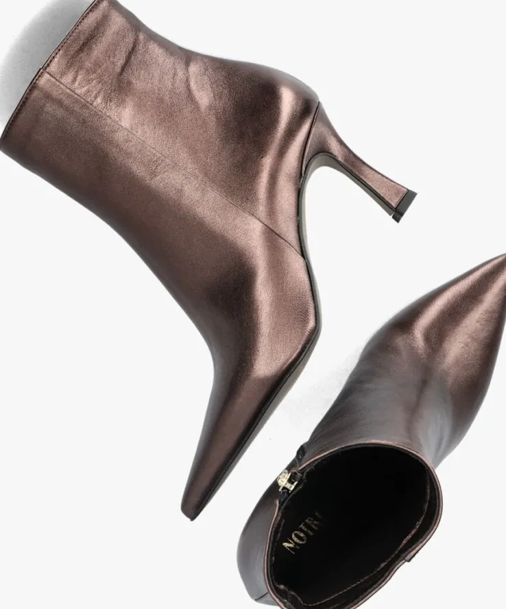 Ga voor een chique look met deze enkellaars 19536 van het toffe merkNOTRE-V!Dit modelheeft een bovenwerk van hoogwaardig leer in een mooie, bronskleurige kleur. De laars heefteen rechte schacht met een handige ritssluiting aan de binnenzijde om ‘m gemakkelijk aan en uit te trekken. Opvallend detail is de naar binnen gestikte naad aan de schacht en de goudkleurige ritshanger met merkreliëf. Verder heeft dit item een trendy puntige neus met een kittenheel van zo’n 8 centimeter hoog. Het binnenwerk bestaat uit zacht leer in combinatie met leatherlook dat comfortabel aanvoelt aan je voeten en de schoen heeft een vast voetbed. De kunststof loopzool geeft de laars een mooi afgewerkt geheel en met het fijne lijntjesprofiel heb je een goede grip. Deschacht is 15 centimeter hoog, gemeten bij maat 38. Draag de schoenen elegant onder eenjurkje of stoer onder een jeans!
