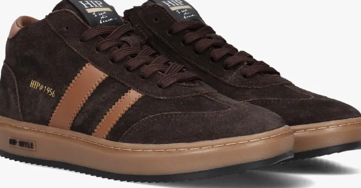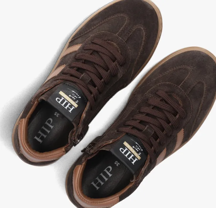 Deze donkerbruine lage sneakerH1253 van het merk HIP is aan de buitenkant uitgevoerd insuède met een bruine leren accenten. De voering is gemaakt van leer en heeft een uitneembaar voetbed. De zool is gemaakt van rubber en heeft een gripvast profiel. Je trekt ‘m gemakkelijk aan en uit dankzij de ritssluiting naast de vetersluiting. Ideaal, want zo hoef je niet iedere keer de veters te strikken. Combineer ‘m onder een jeans, pantalon of joggingpak.