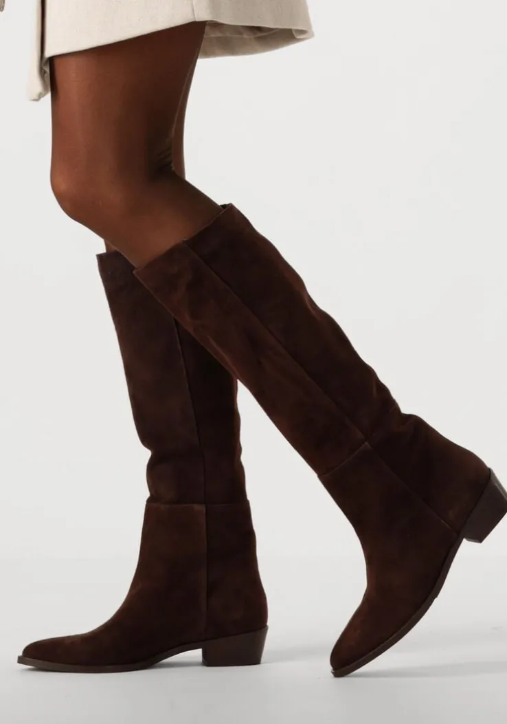 Stap stijlvol de dag in met deze elegante hoge laarzen van NOTRE-V. Gemaakt van bruin suède, bieden deze laarzen niet alleen een chique uitstraling, maar ook ultiem comfort dankzij de leren binnenkant. De puntige neus en de stevige blokhak van 4 cm geven je een verfijnde look, perfect voor een dag op kantoor of een avondje uit. Met een schachthoogte van 43 cm en een rubberen zool, zijn deze laarzen ideaal te combineren met een strakke jeans of een stijlvolle rok. Voeg een vleugje klasse toe aan je garderobe met deze tijdloze laarzen.