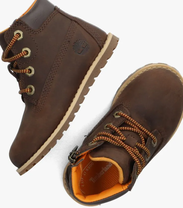 Met deze stoere bruine enkelbootPOKEY PINE 6IN BOOT KIDS van het merk Timberland ben je klaar voor het seizoen! Dit model van eersteklas nubuck heeft een vetersluiting en een rits aan de zijkant. DeSplash Blasterâ„¢ finish over het bovenwerk maakt de schoen water- en vlekbestendig en het uitneembare Ortholite® voetbed voelt zacht aan en gaat geurtjes tegen. De rubberen buitenzool met grof profiel is gemaakt van 42% gerecycled rubber en biedt grip en duurzaamheid.Met de ‘Does it fit?’ zool kan je precies zien of het de juiste maat is. Je haalt de zool eruit en laat de kleine erop staan, dan lees je af of de maat ’too smal’, ‘just right’ of ’too big’ is. Handig!