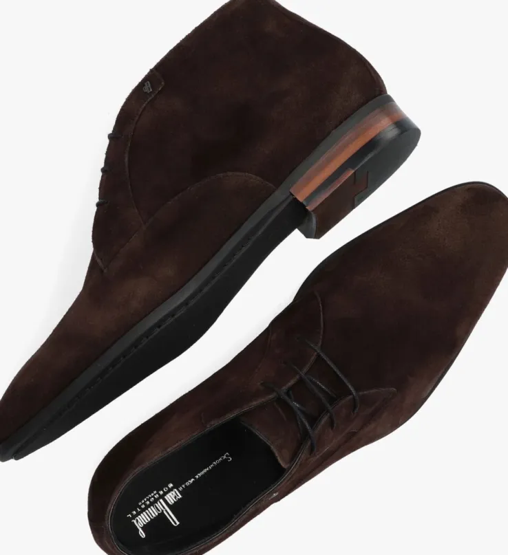 De afgelopen tijd is het merk Van Bommel druk bezig geweest met de restauratie van hun collectie van zorgvuldig uitgewerkte klassieke herenschoenen van Hollandse bodem. Deze donkerbruine hoge nette schoen20057is dan ook een mooi voorbeeld van een prachtige klassieke schoen die je prima aan je garderobe kunt toevoegen. Het bovenwerk is uitgevoerd in zacht suèdemet een lichte carré-neus en een metalen Van Bommel-tag op de schacht. De sierlijke vetersluiting met fijne ronde veter geeft deze schoen een stijlvolle uitstraling. De luxe leren zool is volgens de Blake-maakwijze op de schoen gezet, waarbij het bovenwerk over de binnenzool wordt getrokken en vastgezet. De onderkant wordt opgevuld met flexibel kurk en daar wordt onder hoge druk de zool op geperst. De zool wordt daarnaast ook nog ‘van binnen doorgenaaid’ met een stikdraad door de zool. Deze maakwijze zorgt voor een slanke, elegante vorm en een stevige, duurzame kwaliteit. De loopzool en het loopvlak van de hak zijn opgedeeld in een vlak slijtvast rubber en een vlak van leer voor een uitstekende grip. Deze schoen met iets bredere G+-wijdte is gevoerd met leer en heeft een vast voetbed met lichte demping.