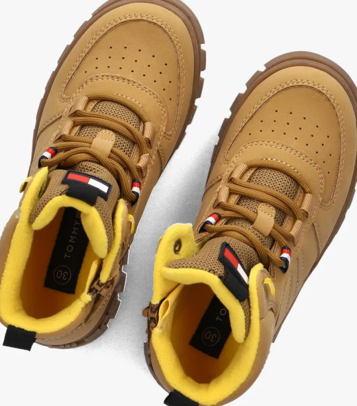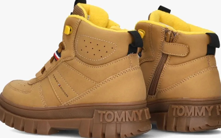 Ga op avontuur met de stoere 34129 boots voor jongens. Deze camel kleurige schoenen van Tommy Hilfiger zijn perfect voor een herfstwandeling in het bos of een winterse speurtocht in de sneeuw. De buitenkant is gemaakt van stevig materiaal, terwijl de binnenkant je voeten warm houdt met zacht textiel. Combineer ze met een comfortabele jeans en een warme trui voor een coole, seizoensgebonden look. De stevige zool biedt grip op gladde paden, zodat je zorgeloos kunt rennen en spelen. Deze boots zijn de ideale keuze voor actieve jongens die graag buiten zijn, ongeacht het weer.