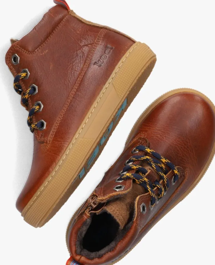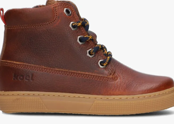 Dezehoge sneakers 03M008 van het merk KOEL4KIDS zien er superstoer uit! De buitenkant is gemaakt van cognackleurig leer, heeft een suède tong eneen zachte faux fur voering met een leren uitneembaar voetbed. De voering steekt er net iets bovenuit en zorgt voor een unieke en speelse look. Het donker blauwe met gele vetertje valt lekker op maar je trekt ‘m nog gemakkelijker aan en uit dankzij de handige ritssluiting. De hiel is versierd met het herkenbare textiele aantreklusje. Op de tong en aan de hiel bevinden zich reliëf merkopdrukken.De rubberen zool heeft een gripvast KOEL profiel.