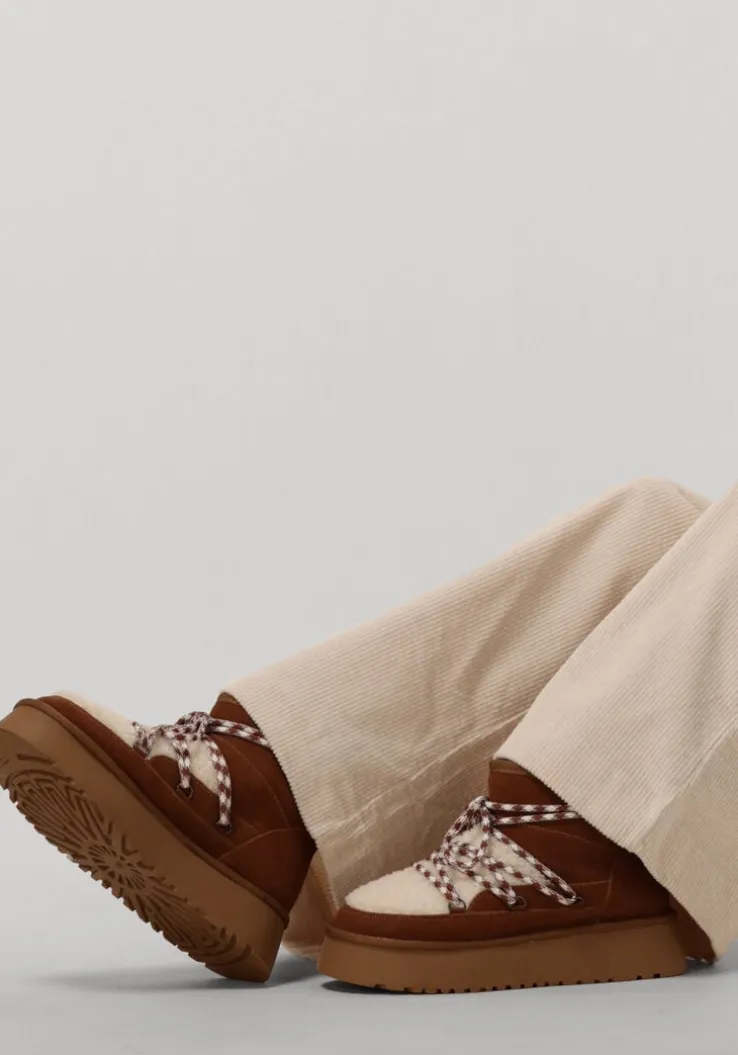 Met de FEMM snowboots van NOTRE-V ben je klaar voor de winter! Deze cognackleurige snowboots zijn speciaal ontworpen voor dames die de kou trotseren. De buitenkant is gemaakt van suède met een voorvoet van faux fur. De binnenkant is ook gevoerd met zacht faux fur, zodat je warme voeten blijft houden. De plateauzool zorgt voor extra comfort en de rubberen zool biedt goede grip op gladde ondergronden. Extra tof aan dit model zijn de driehoekveterlusjes en de grove veters over het gehele bovenwerk. Draag de FEMM snowboots tijdens winterse wandelingen of op de skipiste. Combineer ze met een warme winterjas en een gebreide muts voor een stijlvolle winterlook!
