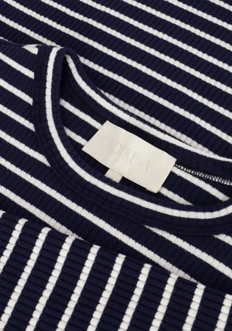 Maak kennis met de NV-EELKE ROUND NECK van NOTRE-V, een stijlvolle donkerblauwe top die niet mag ontbreken in je garderobe. Deze veelzijdige top met subtiele strepen draag je moeiteloos tijdens een dagje shoppen of een gezellige lunch met vriendinnen. Combineer met een strakke jeans voor een casual look of draag onder een blazer voor een chique touch. De ronde halslijn en het zachte materiaal zorgen voor een comfortabele fit, terwijl de tijdloze kleur zwart je outfit altijd een elegante uitstraling geeft. Voeg deze must-have toe aan je collectie en geniet van eindeloze combinatiemogelijkheden.