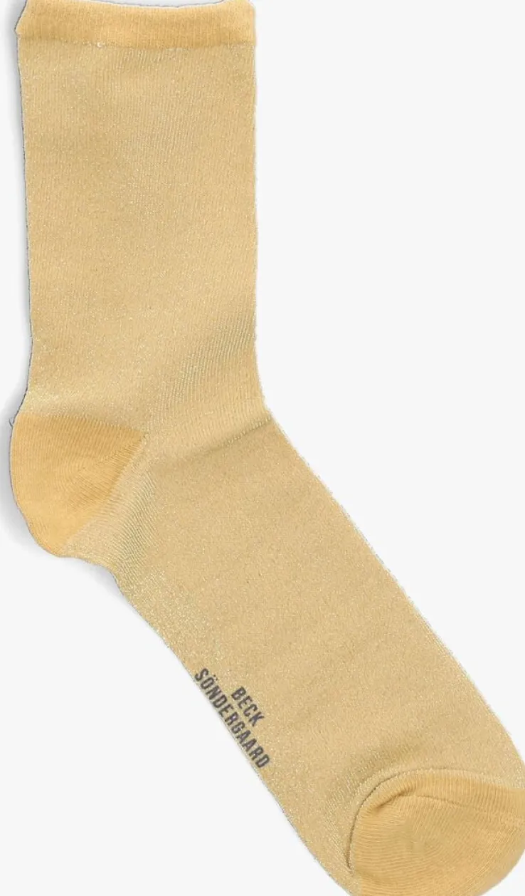 In 2003 startten AnnaSøndergaardandLis Beck hun Deense merkBecksondergaard. Een speelse collectie van vindingrijke accessoires met een persoonlijketouchdie seizoen na seizoen gedragen kan worden. Het merk staat bekend om zijn kleurrijke producten met mooie contrasten en unieke prints. Deze sokken DINA SOLIDmaken je outfit helemaal compleet en zorgen voor een vrolijke touch. De sokken zijn gemaakt van oranje textiel met effen boordjes en teenstuk en een goudkleurige glitterfinish. Samenstelling van de sokken: 50% nylon, 28% metaaldraad, 20% katoen en 2% elastaan.
