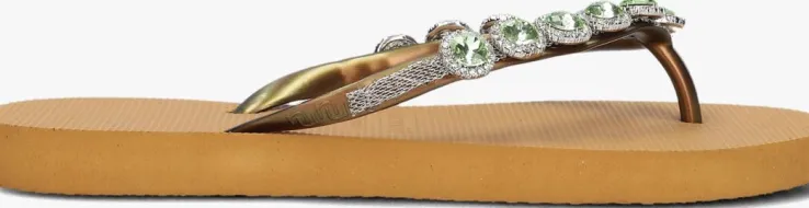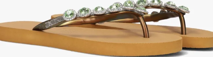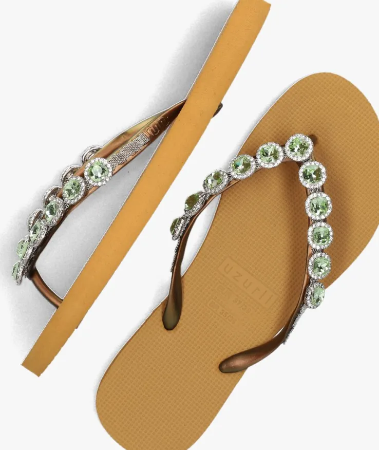 Deze okerkleurige BEATRIX slipper uit de collectie vanUzurii Luxury Footwear is een ware eyecatcher om al die vredige strandjes en drukke boulevards mee af te struinen! De producten van dit Nederlandse modemerk zijn stuk voor stuk handgemaakt met speciale technieken en grote toewijding. Deze luxe slipper is uitgevoerd in hoogwaardig rubber en heeftprachtige groene strass-stenen in de vorm van zwarte bloemenop de goudkleurige rubberen wreefband.De schoenendoos waar deze mooie slippers in worden geleverd heeft een luxe afwerking enaan ze binnenzijde voorzien van een spiegel. Na gebruik kanje ‘m dus gebruiken als handig make-up of sieradenopbergdoos.