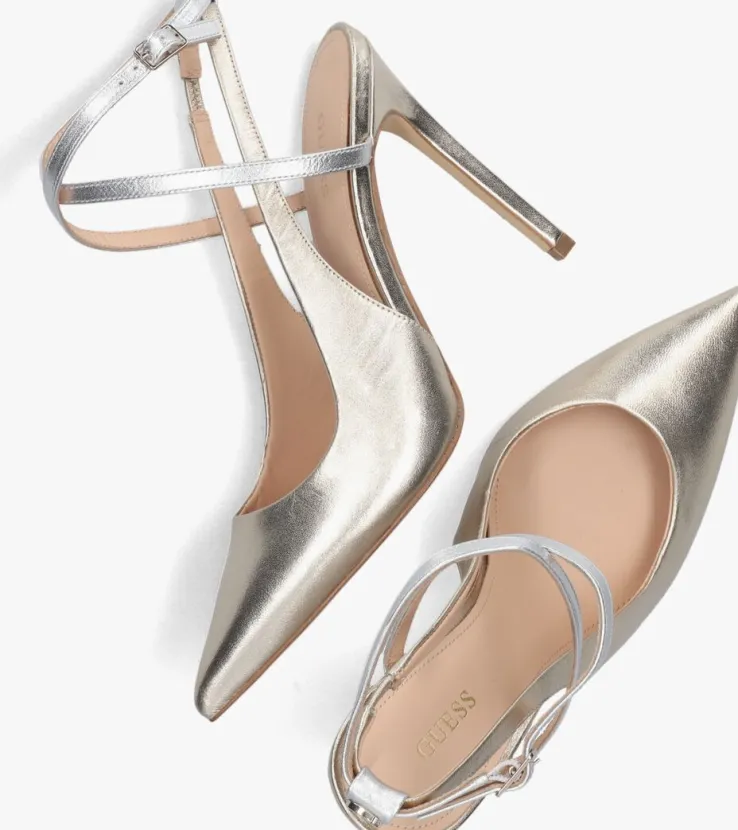 Een vrouwelijke sandaal met een naaldhak en een trendy touch, dat is dit model AMAZIE van het merk GUESS! Deze strappy sandaal van leer maakt jouw outfit helemaal af en heeft mooie kenmerken zoals de goudkleurige kleur, de puntige neus en de stijlvolle zilverkleurige enkelbandjes van leer. Dankzij het metalen gespje blijft de schoen goed aan de voet zitten en de hak van 12 centimeter hoog geeft jou een flinke dosis zelfverzekerdheid! Extra leuk is het metalen G-merkembleem aan de achterzijde van de bandjes. De gripvaste kunststof zool met ribbelprofiel zorgt voor een goede grip en het voetbed is voorzien van een extra leren toplaag met een zachte schuimlaag,zodatje het er de hele dag op vol kunt houden.Combineer ‘m bij jouw favoriete outfit en steel de show!