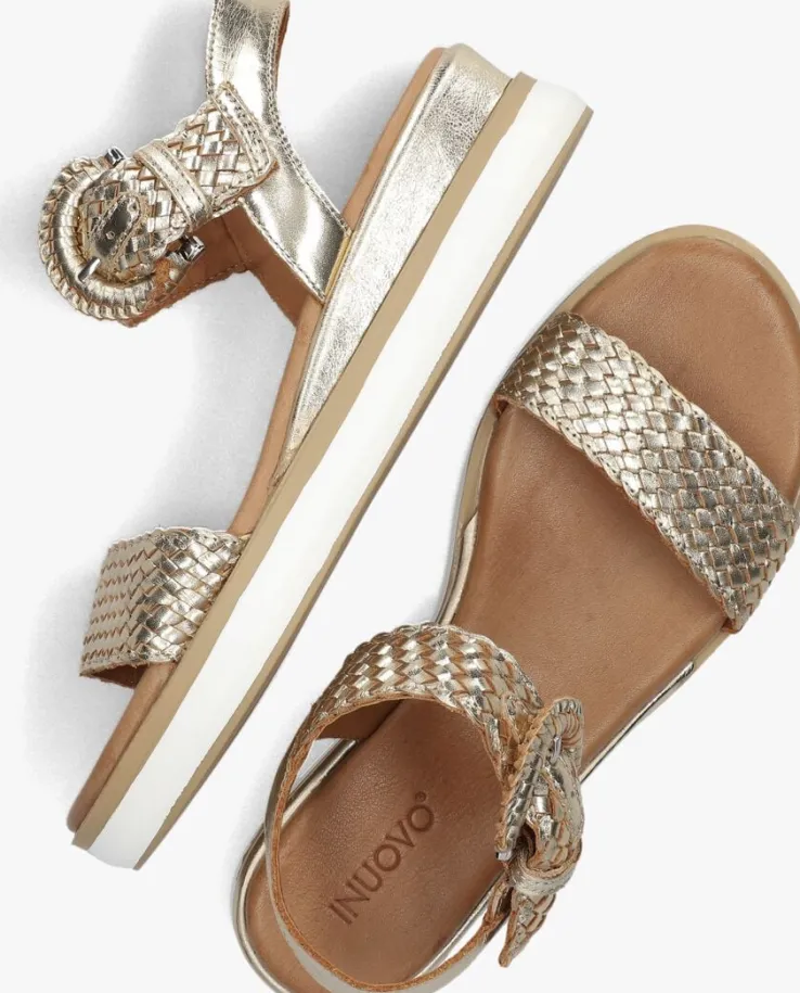 Stap in stijl met deze goudkleurige sandalen van INUOVO. Met vlechtwerk details en een gespsluiting zijn deze sandalen perfect voor een zomerse dag in de stad of een ontspannen strandwandeling. Combineer deze sandalen met een luchtige zomerjurk of een trendy jumpsuit voor een moeiteloze en chique look. Laat jezelf stralen met deze must-have schoenen voor dames!