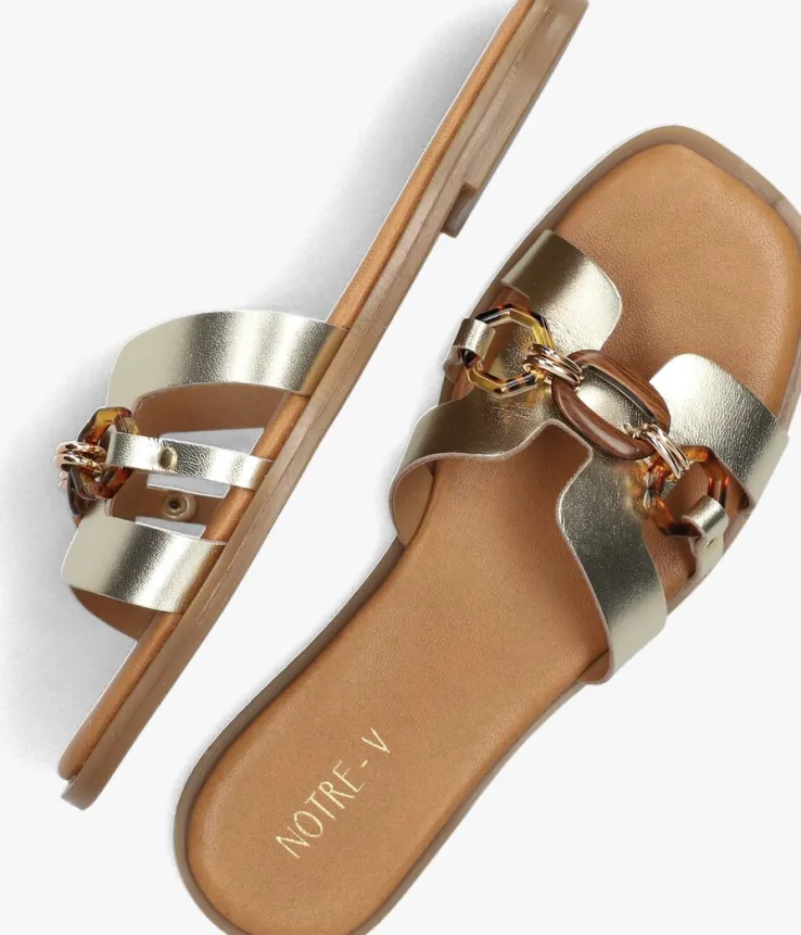 Als je het over hippe slippertjes hebt, dan is de 180H van het merk NOTRE-V er zeker één! Deze goudkleurige slipper is gemaakt van luxe materialen met opvallende accenten en een knipoog naar de laatste trends. Het bovenwerk heeft een brede band van soepel leer met een chain detail van resin, metallic en houtlook voor een chique touch.Het binnenwerk is gemaakt van zachtleer met een gevoerd voetbed voor extra ondersteuning en optimaal loopcomfort. De flexibelerubberen loopzool heeft een laag hakje van ongeveer 2 centimeter hoog en eenfijn lijntjes profiel voor extra grip tijdens al je wandelingen door de stad of over een zonnige boulevard.