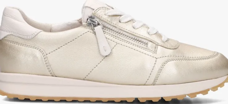 Met deze goudkleurige lage sneaker 4085uit deRelax Weite-collectie van het merk Paul Green heb jij de perfectesneaker voor al jouw dagelijkse bezigheden gevonden.Door de goede pasvorm in combinatie met het dempendevoetbed en de flexibele rubberen zool ervaar je namelijk veelloopcomfort én hij geeft jouw outfitook nog eens een trendy, sportieve touch. De schoen heeft extra ruimte op de voorvoet voor meer ontspanning en daarnaast zorgen de luchtkanalen en het memoryfoam voor een ademende, comfortabele werking. Het uitneembare, leren voetbed heefttevens een duurzaam karakter, doordat hij plantaardig gelooid én recyclebaar is. Het bovenwerk is van topkwaliteit leer en het binnenwerk is een combinatie van vochtabsorberend badstof en leer. Dit item is voorzienvan merkopdrukken op de tong en hiel en een handige ritssluiting langs de veterklep. De witte zool met transparante loopzool heeft een uitstekende grip dankzij het speelse noppenprofiel. Combineer ‘m onder een korte jurk, een toffe jumpsuitof lekker casual onder een jeans om je outfit helemaal af te maken.