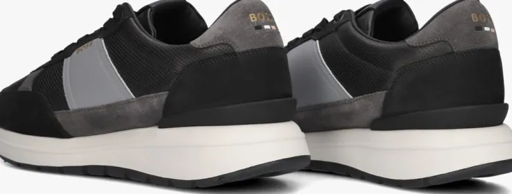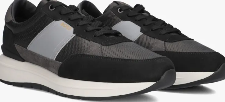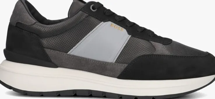 Leren sneaker met mesh voor heren van het merk BOSS. Deze lage sneaker is uitgevoerd in glad grijs leer met zwart. De platte katoenen veters zijn door het materiaal geregen. De merknaam is verwerkt op de tong, zijkant en achterbies. De binnenzijde is uitgevoerd in stof leer en een stevig contrefort draagt bij aan het loopgemak. Het uitneembare voetbed is te vervangen door een persoonlijke inlegzool. De rubberen loopzool heeft een grof profiel voor stevige grip.