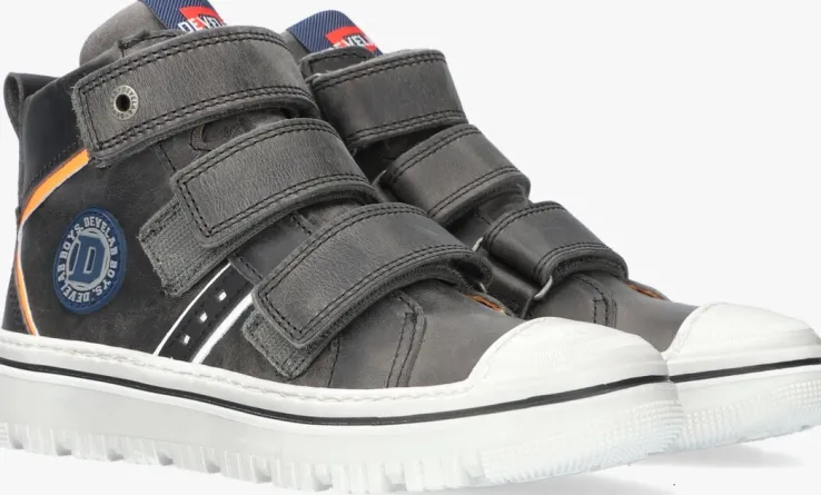 Stoere hoge sneakers zijn een musthave voor alle stoere jochies. Ga voor dit toffe model 41935 uit de collectie van het merk DEVELAB. De buitenkant is gemaakt van grijs leer en heeft een rubberen afwerking op de neus waardoor de neus veel minder snel slijt en de schoen langer mooi blijft ondanks al die klim en klauter avonturen. De enkelkraag is afgewerkt met een handige aantreklus met merk opdruk en in combinatie met de klittenband sluitingen kan je zoontje hem gemakkelijk zelf aan-en uittrekken. Op de tong bevind zich een textiel merklabel en op de zijkant is een rubberen merkbatch te vinden. Extra leuk detail is het neon oranje paneel langs de schacht. De binnenkant heeft een leren voering met een uitneembaar voetbed. De rubberen zool heeft een used look wat de stoere look benadrukt en heeft een gripvast profiel.