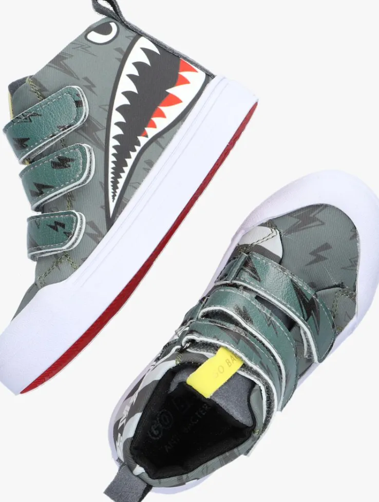 GO BANANAS! Dat gaat zeker lukkenmet deze leuke lage sneakersSHARKYuit de collectie van het gelijknamige merk. Dit vrolijke merk zorgt voor een lach op een ieders gezicht! De buitenkant is gemaakt vanstrak geweven canvas in de kleuren grijs en groen en is voorzien van diverse prints. Zo vind je aande ene kant een grijs gestreepte print met de tekst SHARK ATTACK!! En aan de andere kant een super stoere shark met all over bliksemschichten. Leuk detail is het banaantje achterop de hiel. Op de tong prijkt een geel label met goudkleurig merkopdruk en met de drie handige klittenbandsluitingen trekt je zoontje zelf de schoenen gemakkelijk aan en uit. Extra handig is de witte rubberen stootneus, hierdoor kan de schoen tegen een stootje en blijft de schoen langer mooi. Want bij het klim en klauteren, buitenspelen of een potje voetballen mag niets in de weg staan! Het binnenwerk heeft een canvas voering met een antibacteriële en uitneembare binnenzool. De rode loopzool is voorzien van een gripvast profiel.