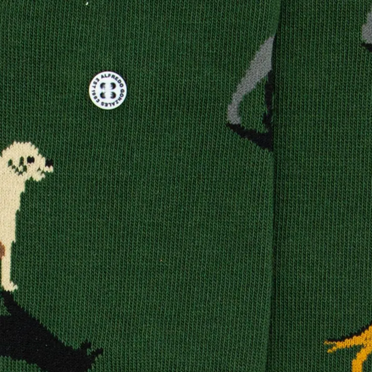 Simpelweg gezegd zijn kwaliteit, stijl en authenciteit de kernwaarden van het merk Alfredo Gonzales. Maar als je naar de mooie producten uit de collectie kijkt zal je zien dat er geen enkele moeite bespaard is gebleven bij het maken van deze creatieve uitingen in de vorm van sokken. De DOGSsokken zijn uitgevoerd in groentextiel met een print van verschillende hondenrassenen hun schaduw. Elk paar Alfredo Gonzales sokken zijn voorzien van een trademark button waardoor ze niet alleen herkenbaar zijn maar wat tevens zorgt voor een prachtig klein detail als toevoeging van elke outfit. Samenstelling van de sokken: 78% katoen, 18% nylon en 4% lycra.