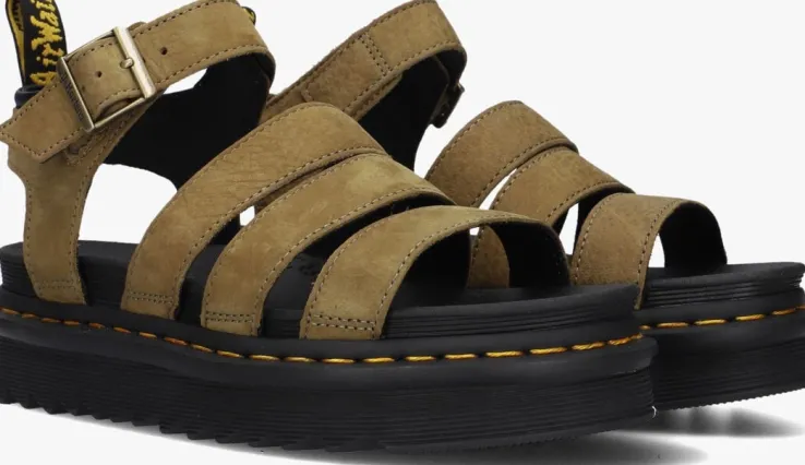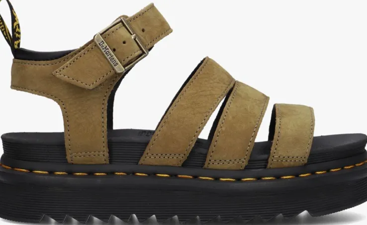 Een klassieke sandaal met een karaktervolle, stoere Dr. Martens-stempel, dat is deze groene sandaalBLAIRE. Dittoffe item is gemaakt van gestructureerd nubuck en het binnenwerk met een rubberenSoftWair™-voetbed met dempend karakter. De sandaal heefteen aantalkenmerkende Dr. Martens accenten zoals de gegroefde zoolrand en de ultrastevige Goodyear-zoolrand met geel stiksel. Hij kangemakkelijk passend aan de voet worden gemaakt door de gespsluiting aan het enkelbandje. Deze sandaal steunt op een dikke, maar superlichte zool van ongeveer 4 centimeter onder de voorvoet en loopt naar achteren toe op tot 6centimeter dik. Met deze sandaal ben je klaar om de wereld te gaan verkennen!