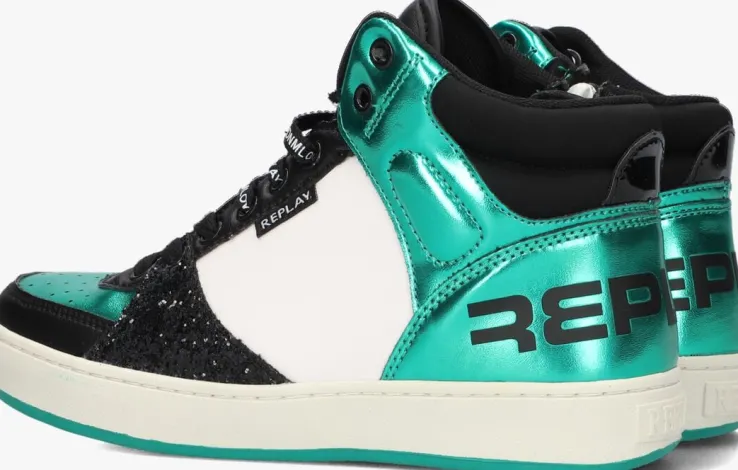 Deze opvallende hoge sneaker COBRA 7CC van REPLAY is gemaakt van wit leatherlook met panelen van groen metallic en zwart leatherlook. Opvallend is het paneel met glitters bij de voorvoet, de perforaties op de neus, de veters met tekst, het merklabel op de tong, het oversized merkembleem op de hiel en het merklabeltje op de zijkant. Je trekt dit model razendsnel aan door de aantreklus op de achterkant in combinatie met de ritssluiting aan de binnenzijde. De voering bestaat uit textiel en het dempende voetbed is uitneembaar. De rubberen zool heeft een gripvast profiel in de groene loopzool.