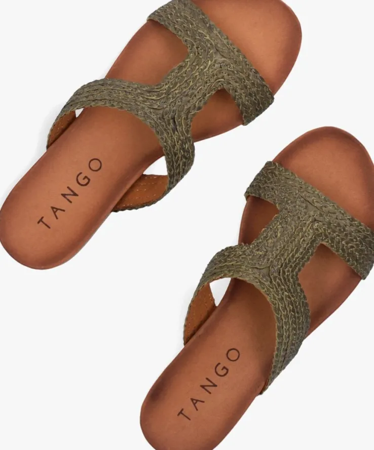 Is it summer yet? Deze groene MILA slipper van het merk Tangozijn perfecte voor iedere zomerlook! Opvallend is de H-vorm van de leren band met cut-outs en het gevlochten bovenwerk, deze geeft de slipper een extra stoure touch in combinatie met het bruine voetbed.De slippers zijn geheel van leer gemaakt,dezool is gemaakt van rubber en heeft een fijn profiel. Draag de slippers met je favoriete zomerjurk, onder een rokje of een mooie denim jeans.