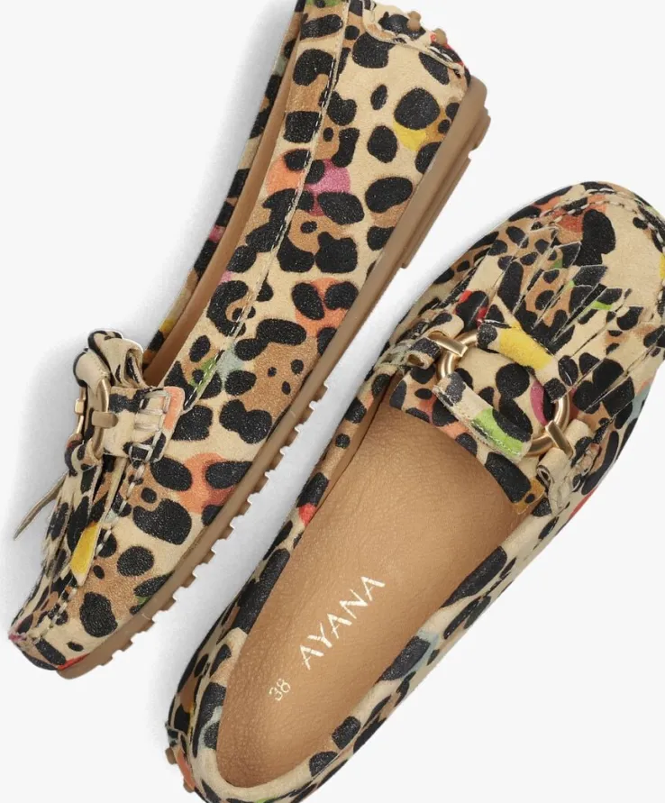 Stap in stijl met deze prachtige suède mocassins van AYANA. De kleurrijke details maken deze schoenen perfect voor elke gelegenheid. De mocassins is gemaakt van zacht suède met leopard print en goudkleurige buggle op de wreef. De hiel is extra beschermd door de rubberen stoot noppen op de achterzijde. De binnenkant is van leer en het voetbed is uitneembaar. De schoen heeft een ultiem comfort door de rubberen zool met noppen profiel, perfect voor dagelijks gebruik. Laat je creativiteit de vrije loop en creëer jouw eigen unieke stijl met deze eyecatchers aan je voeten. Laat jezelf stralen en voeg deze must-have schoenen toe aan je collectie.