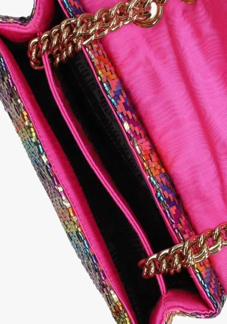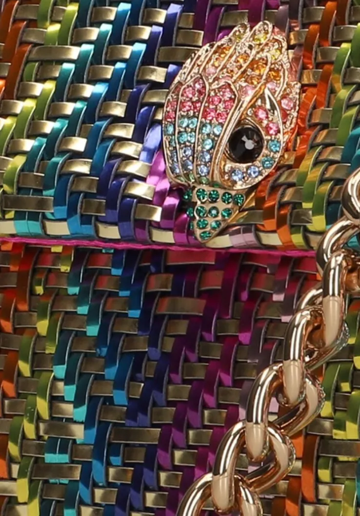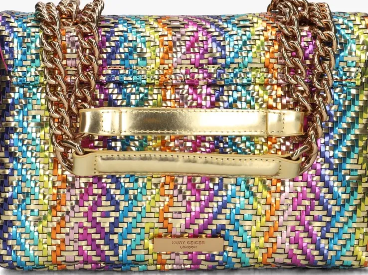 Het innovatieve en creatieve merk Kurt Geiger London is ontstaan in de bruisende straten van Londen. Hier halen zij hun inspiratie vandaan en begint het creatieve proces. Zo maken ze al meer dan 50 jaar unieke ontwerpen waarbij regenboogkleuren centraal staan in de vele ontwerpen. Deze kleurrijke schoudertas KENSINGTON BAG is gemaakt van hoogwaardig metallic leren banen en heeft een prachtige afwerking. De tas is gesierd met mooie accenten zoals de adelaar met strass-steentjes op de klep, het metalen merkembleem op de achterzijde en de grove metalen schouderketting met metallic leren inzetten. Het binnenwerk met een zwarte voering van leer en textiel kan worden afgesloten met een klep met dubbele magneetsluiting en in de drie steekvakken kun je perfect je spulletjes organiseren. De schouderketting kan zowel lang als kort worden gedragen, ideaal voor elke gelegenheid dus! Waar combineer jij deze kleurrijke urban schoudertas bij? Afmetingen: 27 x 9 x 18 cm (lengte x breedte x hoogte)